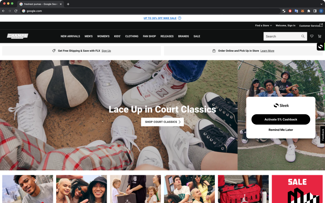Sleek can integrate your cashback and deals to be activated on-the-fly as the user reaches retailer websites. This feature allows users to activate cashback and deals directly on the retailer website, without having to navigate to a separate deal portal.