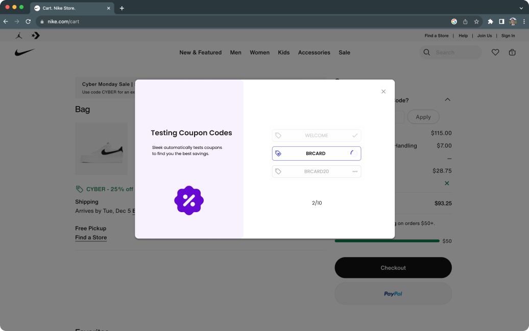 Once a user is on a page where a coupon can be applied, Sleek will automatically apply coupons, testing all available coupons to find the best one for the user’s basket.